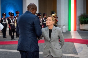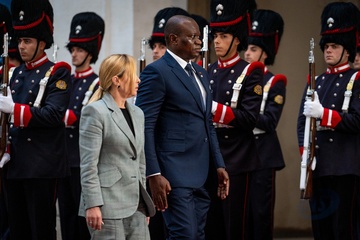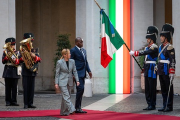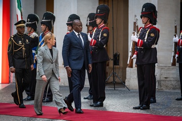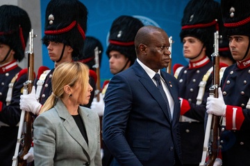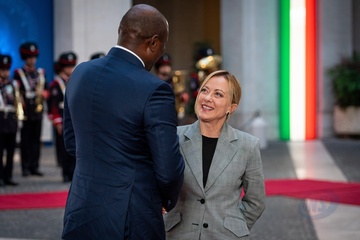 Italian Prime Minister Giorgia Meloni receives the President of the Gabonese Republic, Brice Clotaire Oligui Nguema at Palazzo Chigi in Rome, Italy on 03 November 2025.