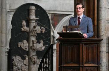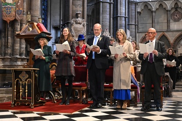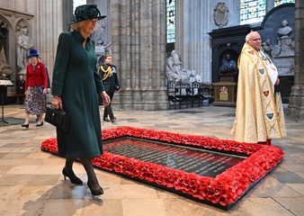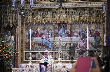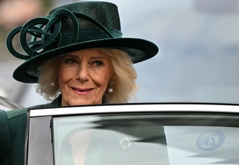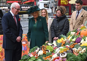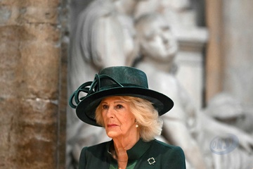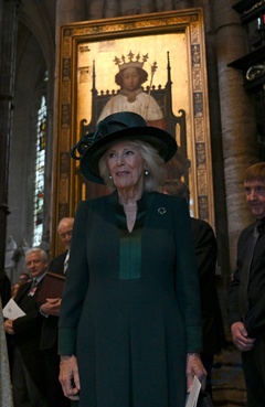 Britain's Queen Camilla attends the National Harvest Festival Service, at Westminster Abbey in London on October 16, 2025.