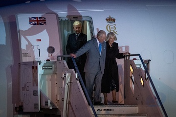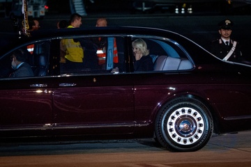 Britain's King Charles III and Queen Camilla arrive at Ciampino 31st Wing Airport in the outskirts of Rome, Italy, on 22 October 2025.