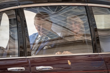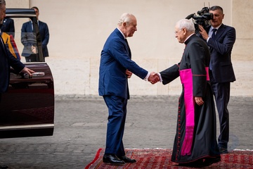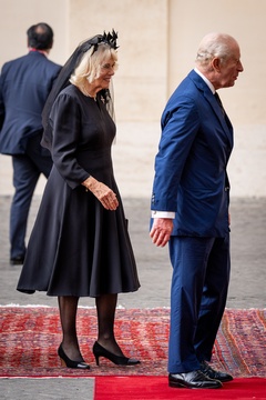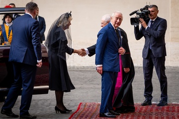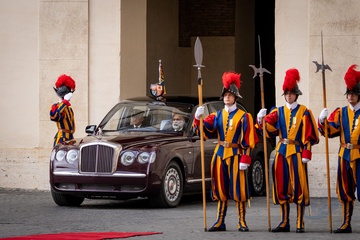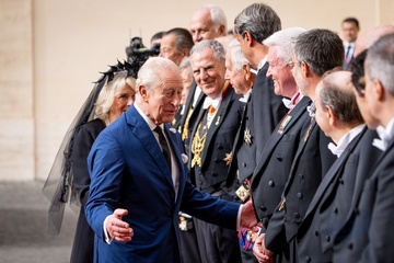 Britain's King Charles III and Queen Camilla arrive in the St. Damasus Courtyard at the Vatican for a state visit, where they will meet with Pope Leo XIV in Vatican City, Vatican, on 23 October 2025. 49
