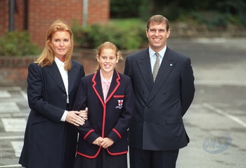 The Duke and Duchess of York's elder daughter Beatrice arrived at St. George's School in Ascot with her parents today to attend the first day at her new school. She was greeted by the headmistress, Joanna Grant Peterkin.