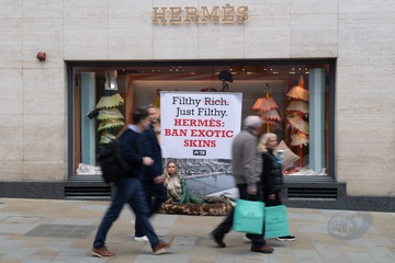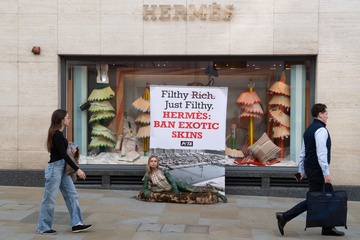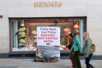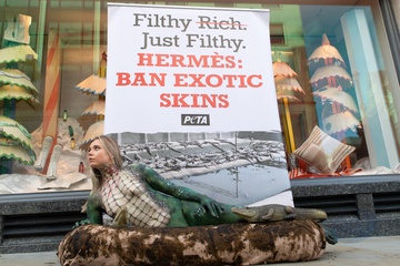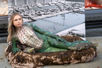 Bodypainted PETA 'Crocodile' in Filthy Pool to Condemn Hermès’ Skins Sales at New Bond Street, London, UK