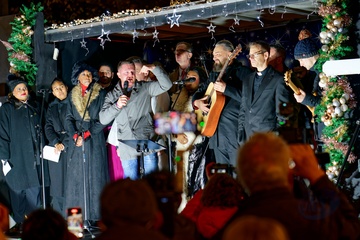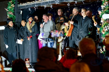 Tommy Robinson on stage at the Put Christ Back in Christmas protest. Whitehall, London, UK Saturday, 13th December.