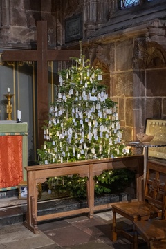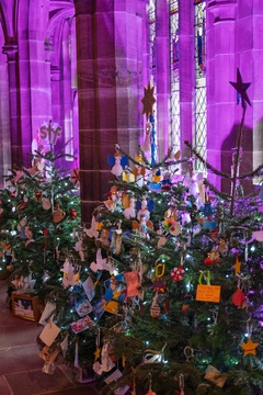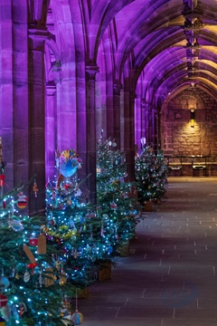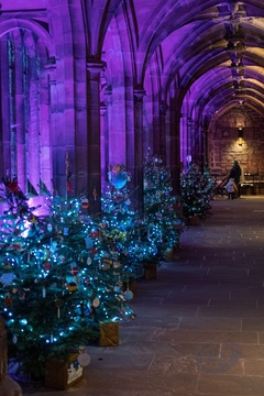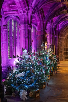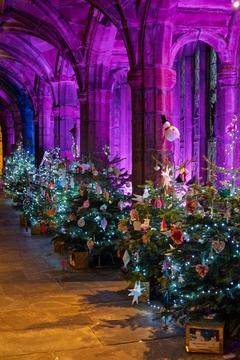Christmas trees on display within Chester cathedral at Christmas time. Chester, Cheshire, North west England.