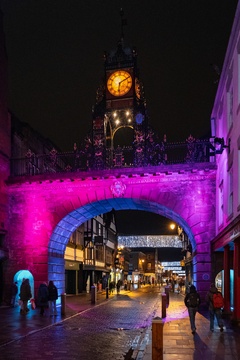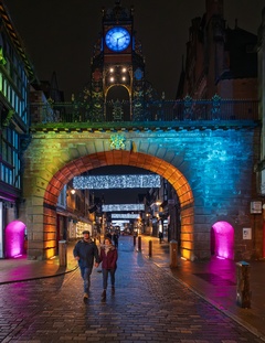 Eastgate clock in Eastgate street at Christmas time Chester at Christmas time. Chester, Cheshire, North west England.