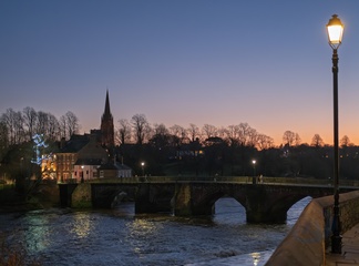 Sunset behind the old Dee bridge . Chester, Cheshire, North west England.