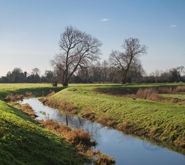 Fenland landscape by a lode (stream or river) which allows drainage on the rich soils in the Fens of East Anglia.
