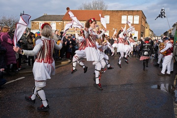 Belles of London city morris dancers at the Whittlesea straw bear festival,held every January in the little town of Whittlesey / Whittlesea in Cambridgeshire, near Peterborough, UK.