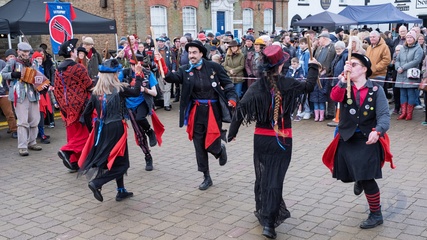 Ely and Littleport Riot morris dancers perform at Whittlesea straw bear festival,held every January in the little town of Whittlesey / Whittlesea in Cambridgeshire, near Peterborough, UK.