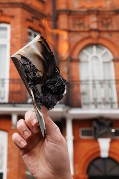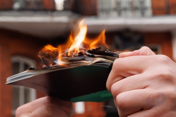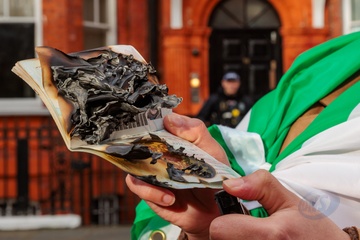 Protester burns Iranian passport, Iranian Consulate, London, UK.