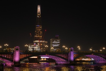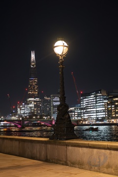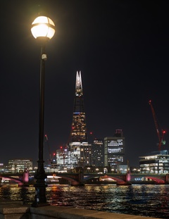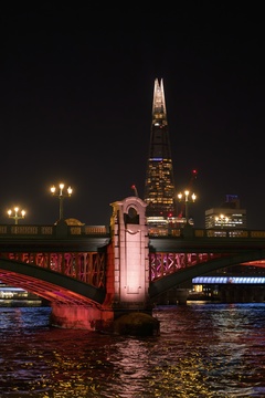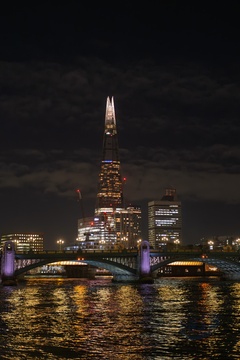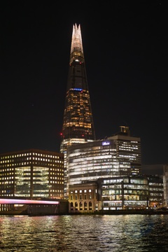 The Shard building seen by the River Thames at night in London.UK