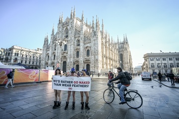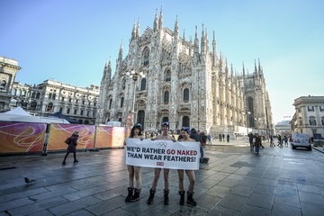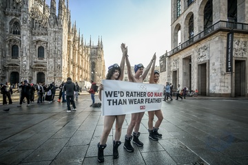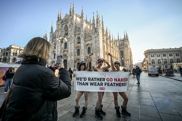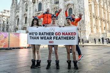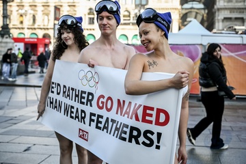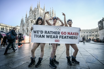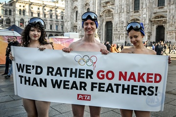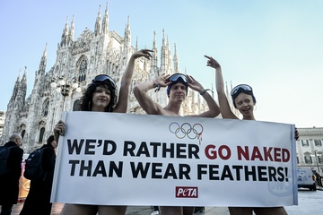 PETA protests "We'd Rather go naked than wear feathers!" before the Olympics.