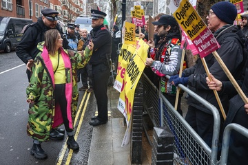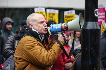 Stand Up to Racism protest against far-right Advance UK event outside Emmanuel Centre in Westminster, London, UK, on 07 February 2026