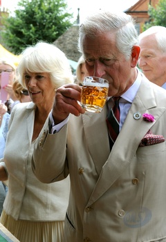 Ksiaze Karol i Camilla pija piwo