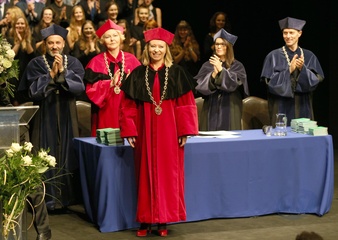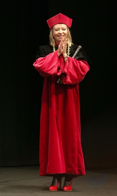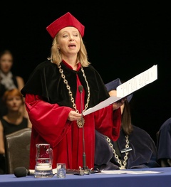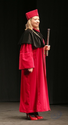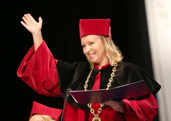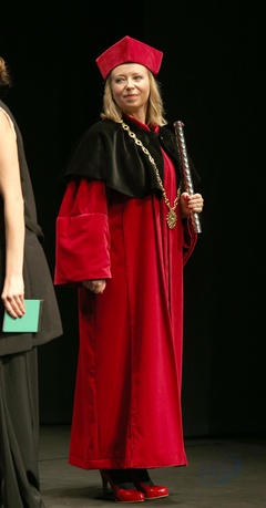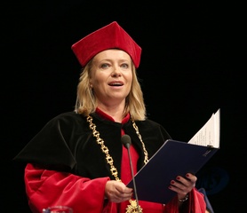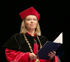 Rektor Dorota Segda w czarnym kolnierzu na znak popracia