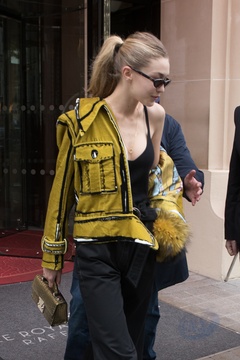 Gigi Hadid w zoltej kurteczce i ze zlota torebka
