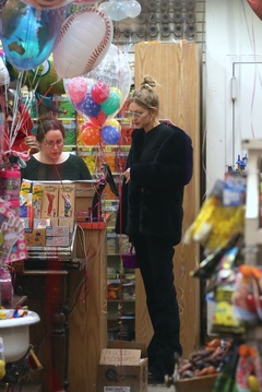 Gigi Hadid w czarnym futerku z rozowym kuferkiem kupuje balony