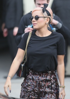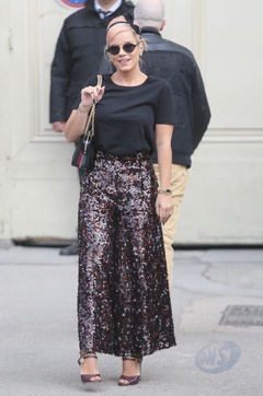 Lily Allen w cekinowych, szerokich spodniach przed pokazem Chanel