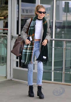 Gigi Hadid w kraciastym szaliku na lotnisku