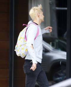 Anwar Hadid w dziurawym swetrze i dzieciecym plecaku na spotkaniu z ojcem