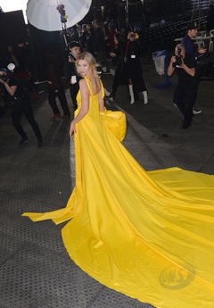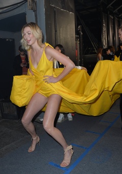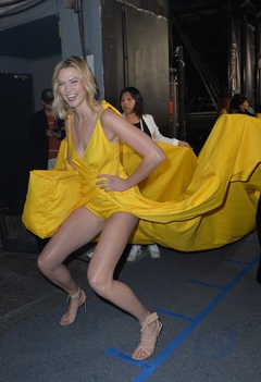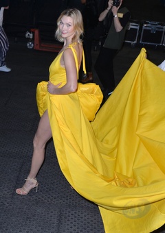 Karlie Kloss z ogromnym, zoltym trenem na backstage pokazu Off-White