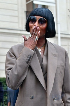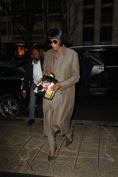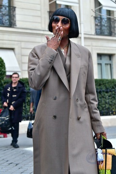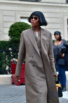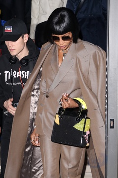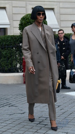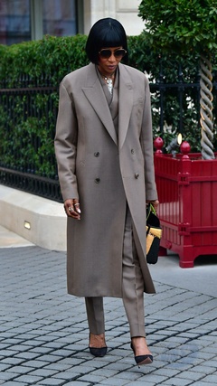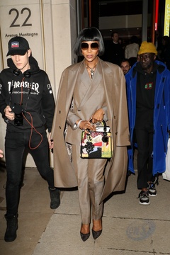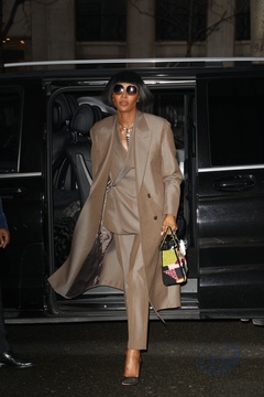 Naomi Campbell w eleganckim plaszczu i z kolorowa torebeczka