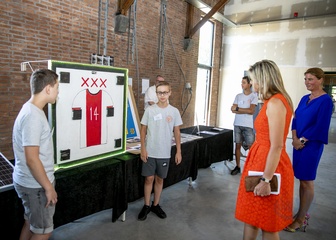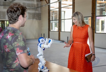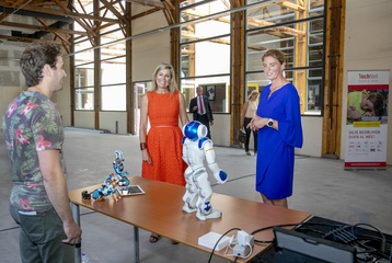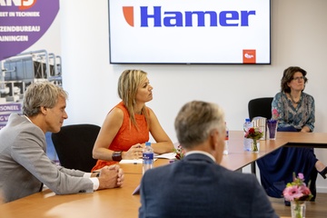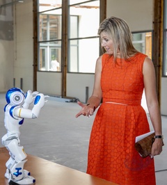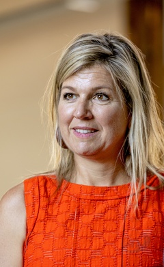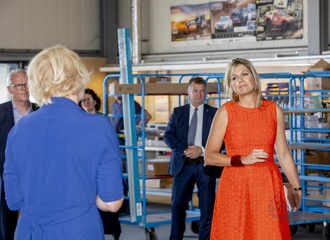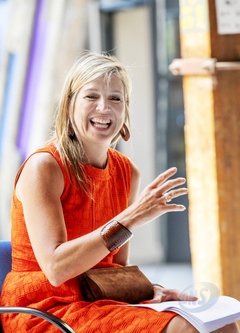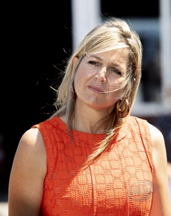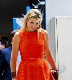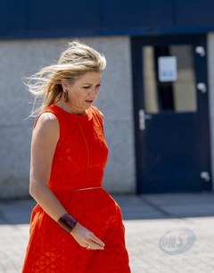 Krolowa Maxima w pomaranczowej sukience, podczas wizyty w Hamer Apeldoorn