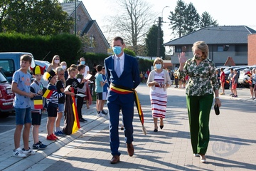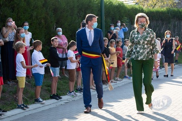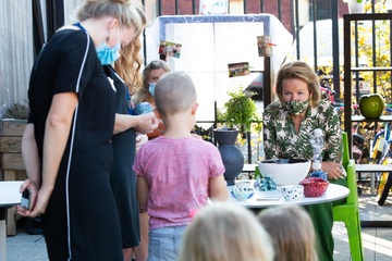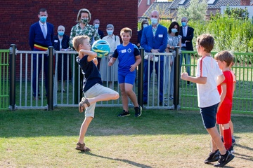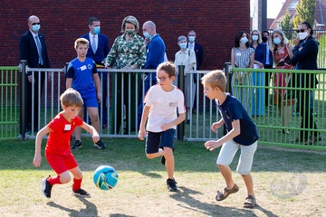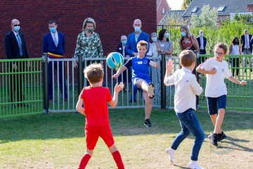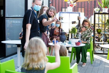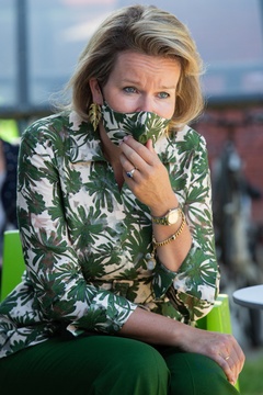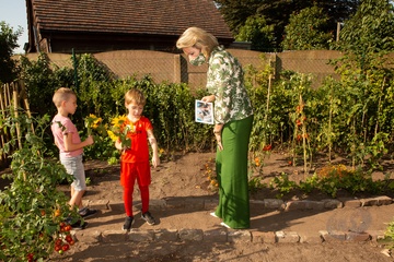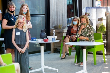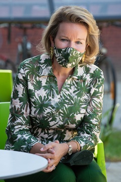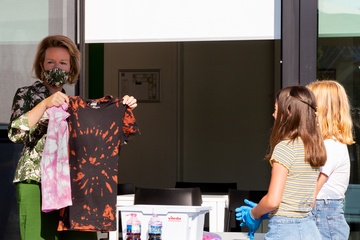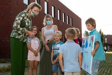 Krolowa Matylda w koszuli w palmy spotkala sie z dziecmi