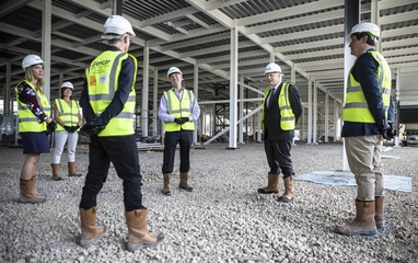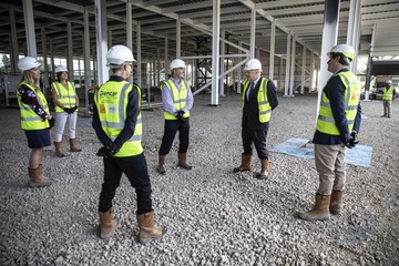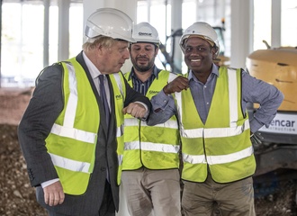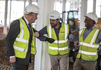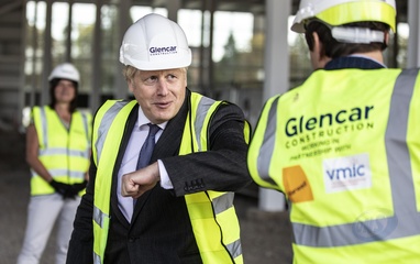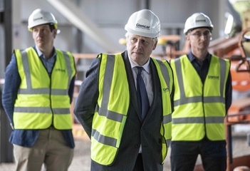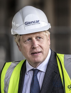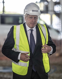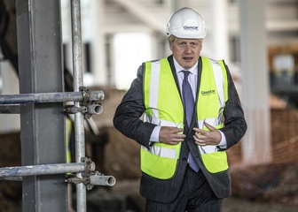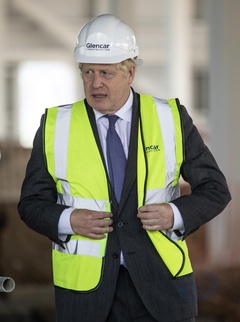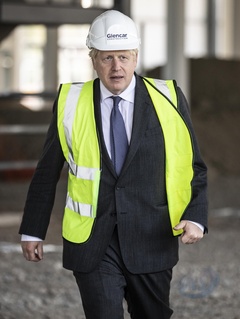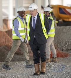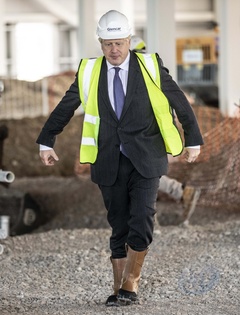 Boris Johnson w kaloszach i w kasku na placu budowy