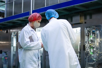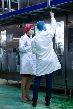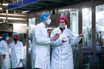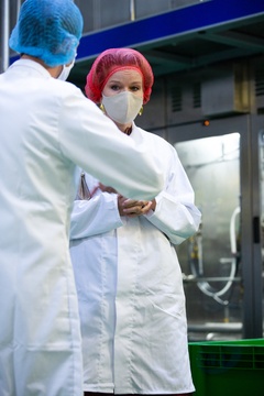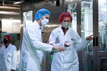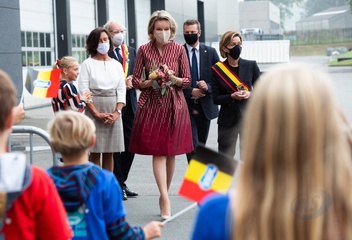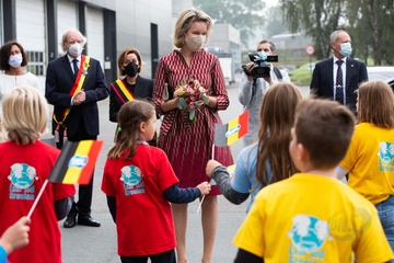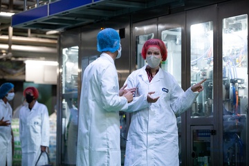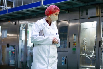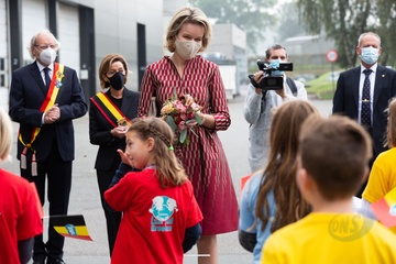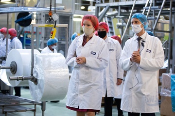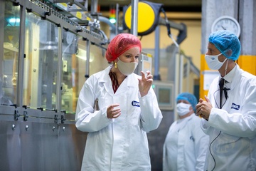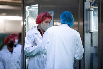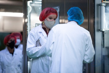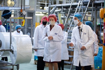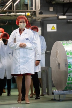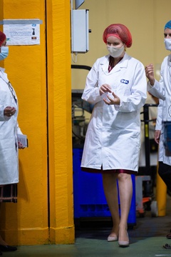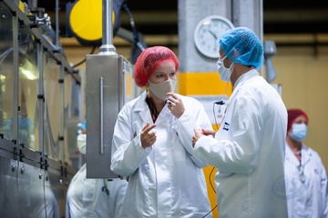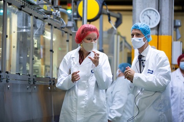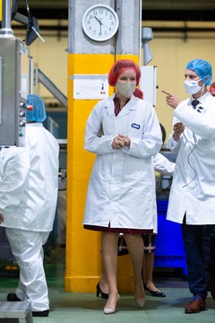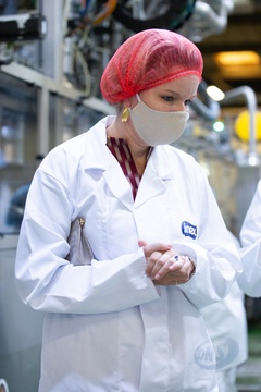 Krolowa Matylda w czepku i w fartuchu podczas wizyty w firmie mleczarskiej