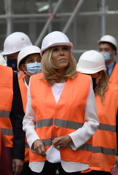 Macronowie w pomaranczowych kamizelkach i w kaskach zwiedzaja zamek Villers-Cotterets podczas remontu