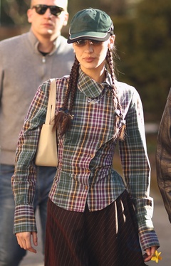 Bella Hadid - bluzka w kratke, spodnica w prazki i 4 warkocze