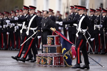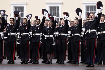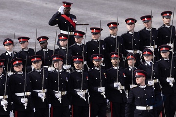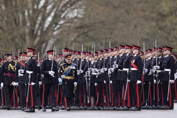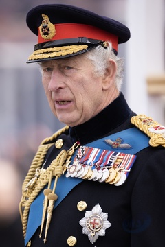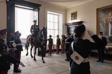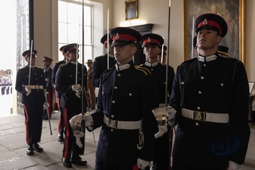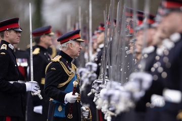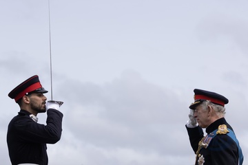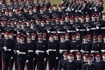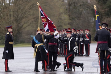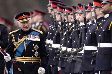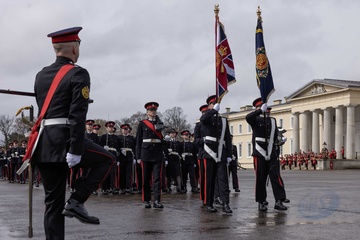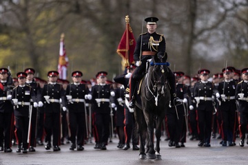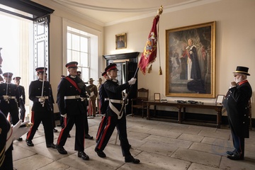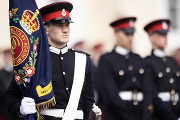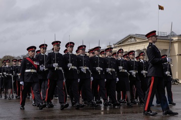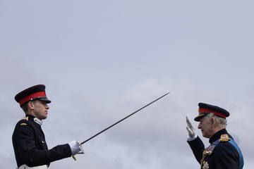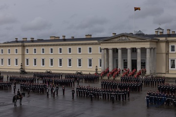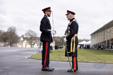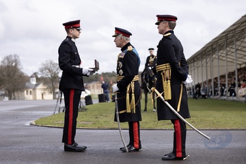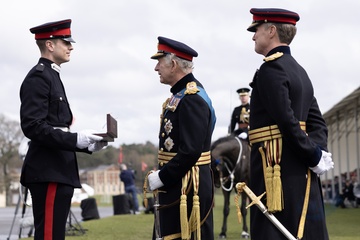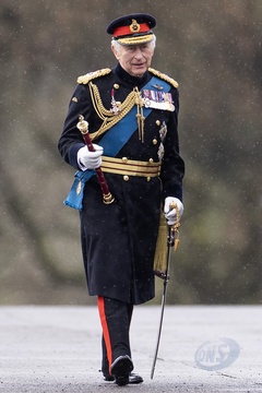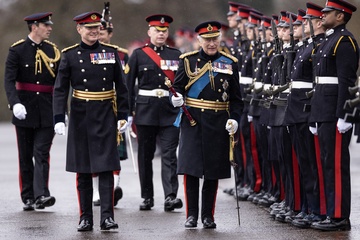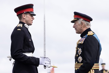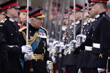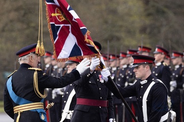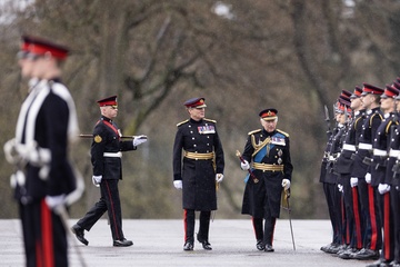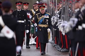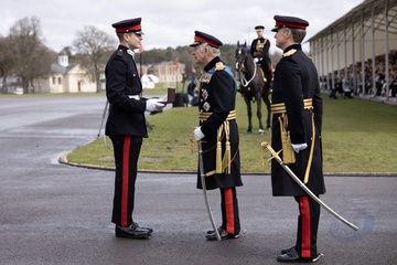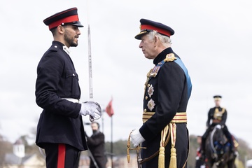 Karol III przeprowadza inspekcję parady władcy w Royal Military Academy Sandhurst_