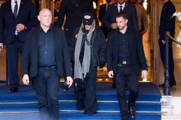 Madonna otoczona przez ochroniarzy przed hotelem Ritz w Paryzu