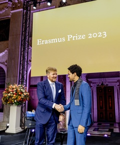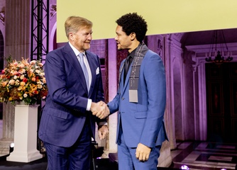 krol Willem-Alexander des Pays-Bas wręcza Trevorowi Noahowi Nagrodę Erasmusa w Pałacu Królewskim w Amsterdamie