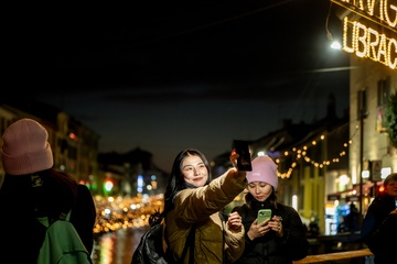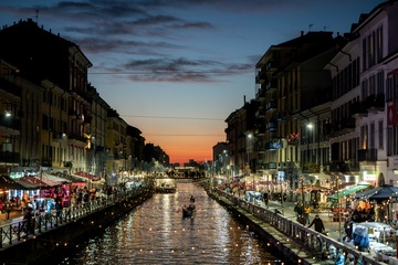 Christmas lights at sunset on the Naviglio Grande, Milan 16 Dec 2023