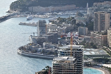 Widok na plac budowy infrastruktury morskiej pod przyszłą rozbudowę, znaną jako Anse du Portier, w Monako