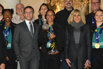 Le président français, Emmanuel Macron et la première dame, Brigitte Macron reçoivent la capitaine de l'équipe de France de handball, Estelle Nze Minko et l’équipe de France féminine de handball championne du monde 2023