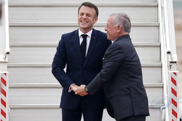 Król Jordanii Abdullah II wita Prezydenta Republiki Francuskiej Emmanuela Macrona po jego przybyciu na lotnisko w Akabie