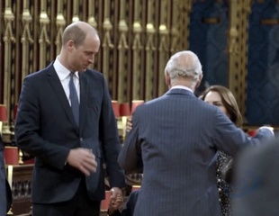 Król Anglii Karol III całuje księcia Williama i Kate Middleton z ich dzieci Jerzego Georga Charlotte Louisa