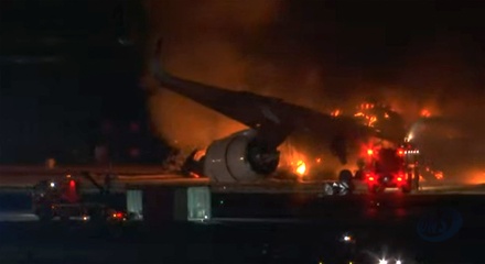 Samolot pasażerski zapala się po zderzeniu na lotnisku w Tokio