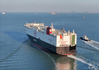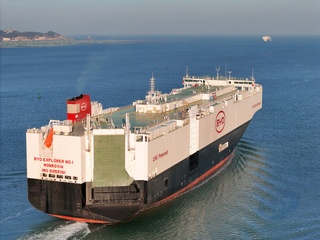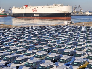 Nowe samochody czekają na załadunek na nowo ukończony statek ro-ro o nazwie BYD Explorer No.1