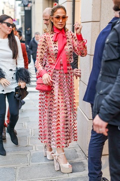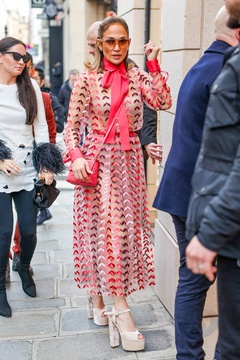 Jennifer Lopez (JLo) à la sortie du restaurant Gigi pour se rendre au défilé Valentino en marge de la Fashion Week de Paris (PFW)
