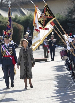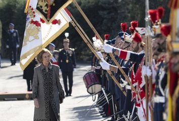 Królowa Zofia podczas składania przysięgi przed flagą w koszarach „El Rey” Gwardii Królewskiej w Madrycie