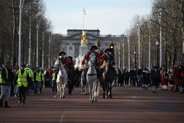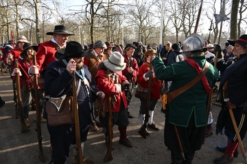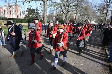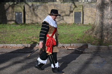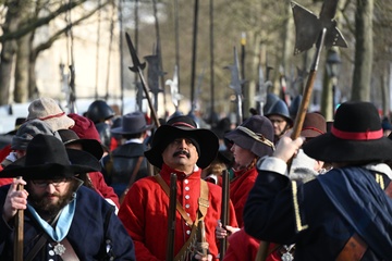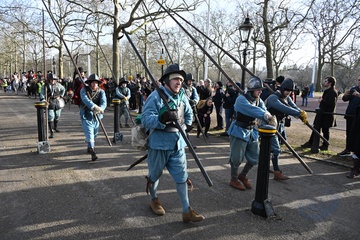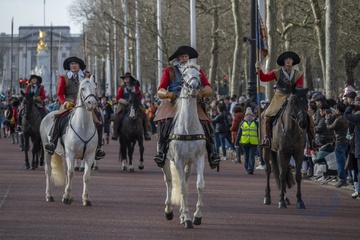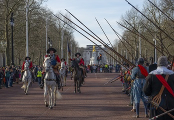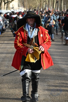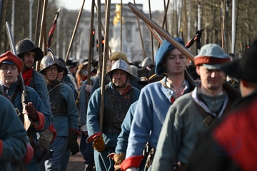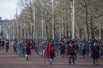 English Civil War reenactors march along The Mall to Horseguards in London, UK, on 28th January, 2024