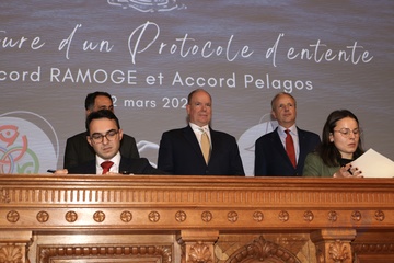Książę Monako Albert II podczas podpisywania protokołu ustaleń, umowy Ramoge i umowy Pelagos w Muzeum Oceanograficznym w Monako 7