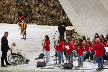 Audiencja Papieża Franciszka z uczniami i nauczycielami Krajowej Sieci Szkół Pokoju w Sali Pawła VI. Watykan, 19 kwietnia 2024 r.”