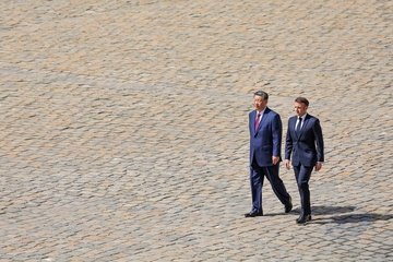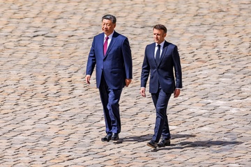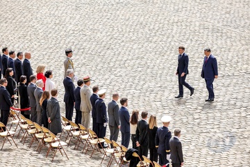 Prezydent Emmanuel Macron, Pierwsza Dama Brigitte Macron, Prezydent Xi Jinping i Pierwsza Dama Peng Liyuan podczas oficjalnej ceremonii powitania w Hôtel National des Invalides w Paryżu 49