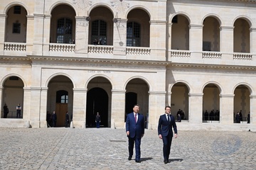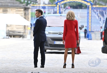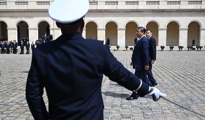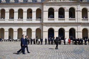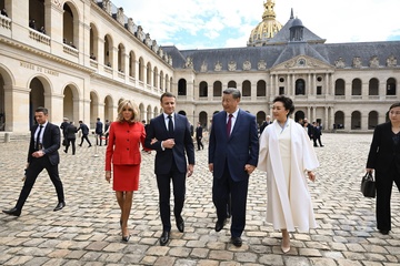 Prezydent Emmanuel Macron, Pierwsza Dama Brigitte Macron, Prezydent Xi Jinping i Pierwsza Dama Peng Liyuan podczas oficjalnej ceremonii powitania w Hôtel National des Invalides w Paryżu 82