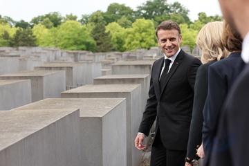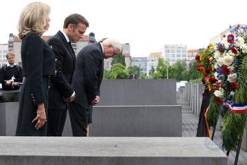 Prezydent Francji Emmanuel Macron i Pierwsza Dama Brigitte Macron, Franck-Walter Steinmeier, Prezydent Republiki Federalnej Niemiec i Pani Elke Budenbender, pod Pomnikiem Holokaustu w Berlinie. 44